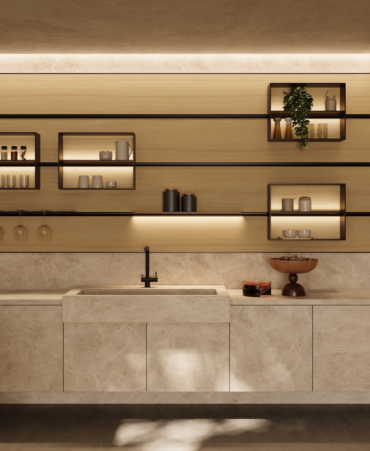 In queste cucine, il contenimento non scompare, ma cambia posizione e linguaggio. Si sposta dal piano alto verso basi più profonde, colonne a tutta altezza e sistemi integrati e discreti, che mantengono la composizione pulita e ordinata. La parete, liberata dagli elementi sospesi, assume un ruolo nuovo: diventa uno spazio che valorizza i materiali e le finiture, trasformando la cucina da ambiente di servizio a luogo da vivere.